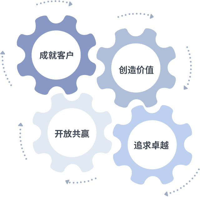 成就客户是一切决策的出发点,,创造价值是衡量所有工作的标准,,,,追求卓越是我们做事做人的态度,,,,开放共赢是我们的格局也是最终的结果。。。价值观的齿轮环环相扣,,,推动着组织里的每个人不断向前。。。