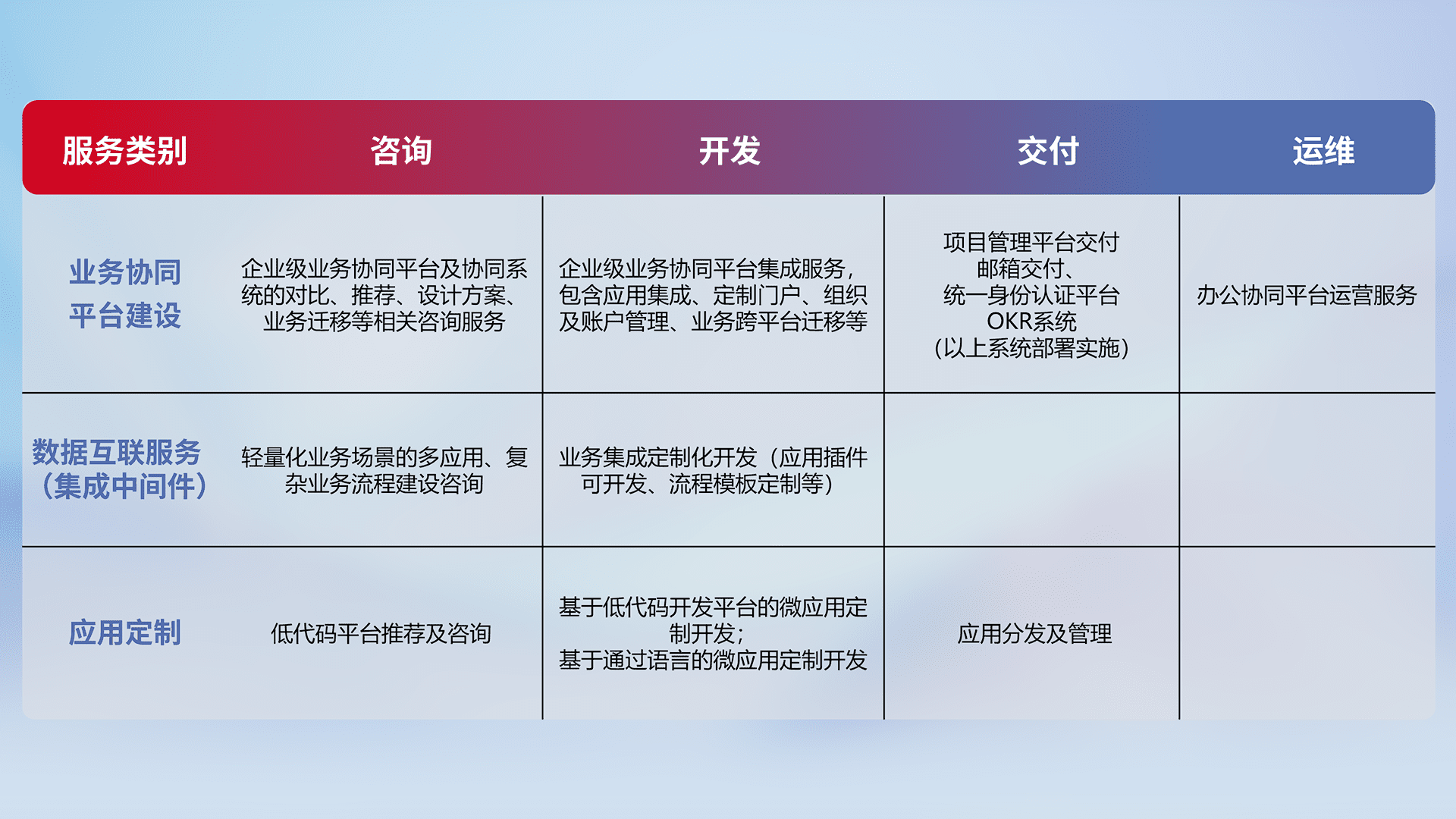 针对钉钉、、、企微、、、、IDaas等平台级产品提供产品的规划、、、、方案、、交付、、、定制化开发等服务,,,实现如统一协同办公、、、、智能客户服务、、混合会议管理、、、、智能数据查询、、、、等业务场景,,,实现数字化转型。。。