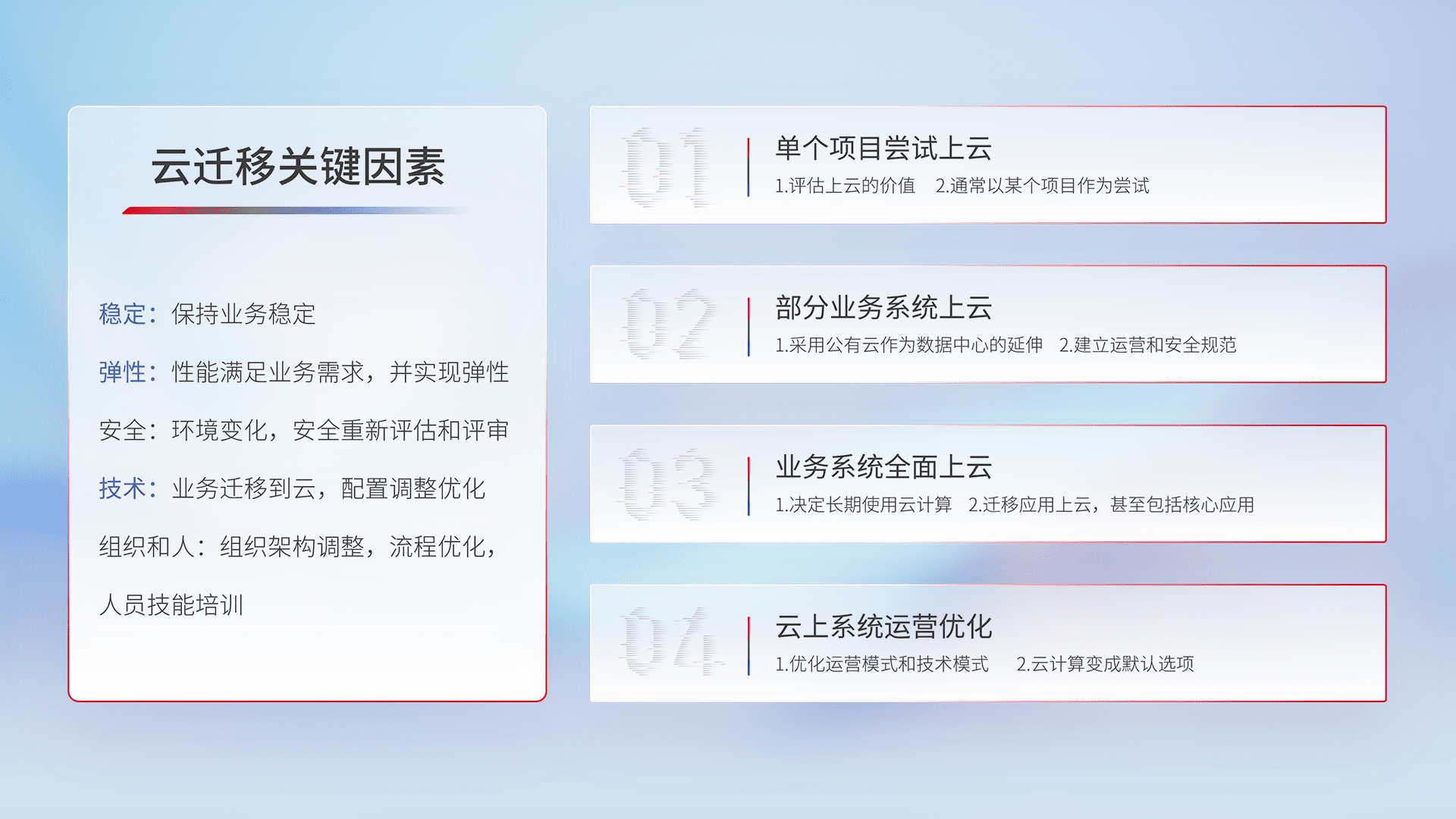 结合实际业务,,从规划设计、、、、云平台选型、、云原生改造、、、数据迁移、、、集成交付,,,,迁移全过程为客户识别最佳上云路径,,,,做好风险识别管理,,,设计网络架构、、、身份权限、、、安全审计合规、、、操作审计、、日志审计、、、、监控告警策略、、、、多站点容灾设计等,,,,对云上基础设施进行整体规划,,提升IT治理水平,,,以满足弹性、、、高可用、、高性能的需求。。。。
