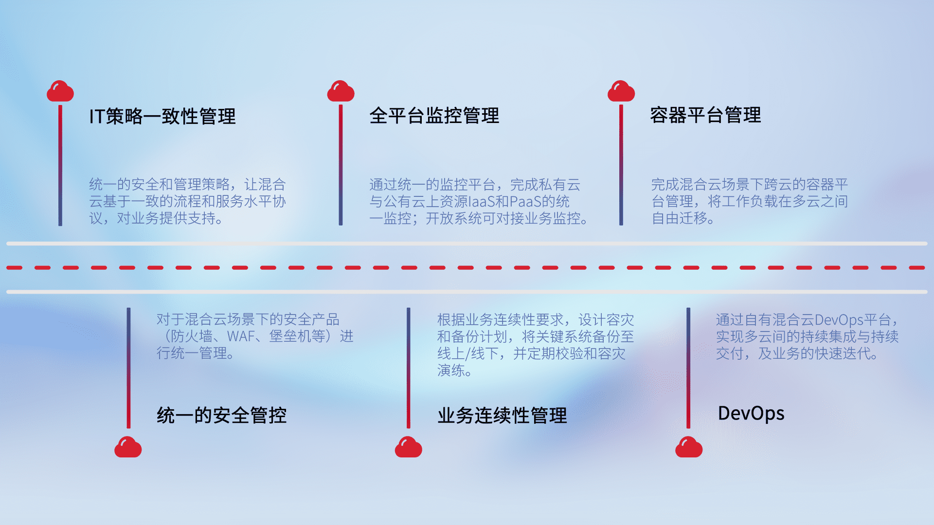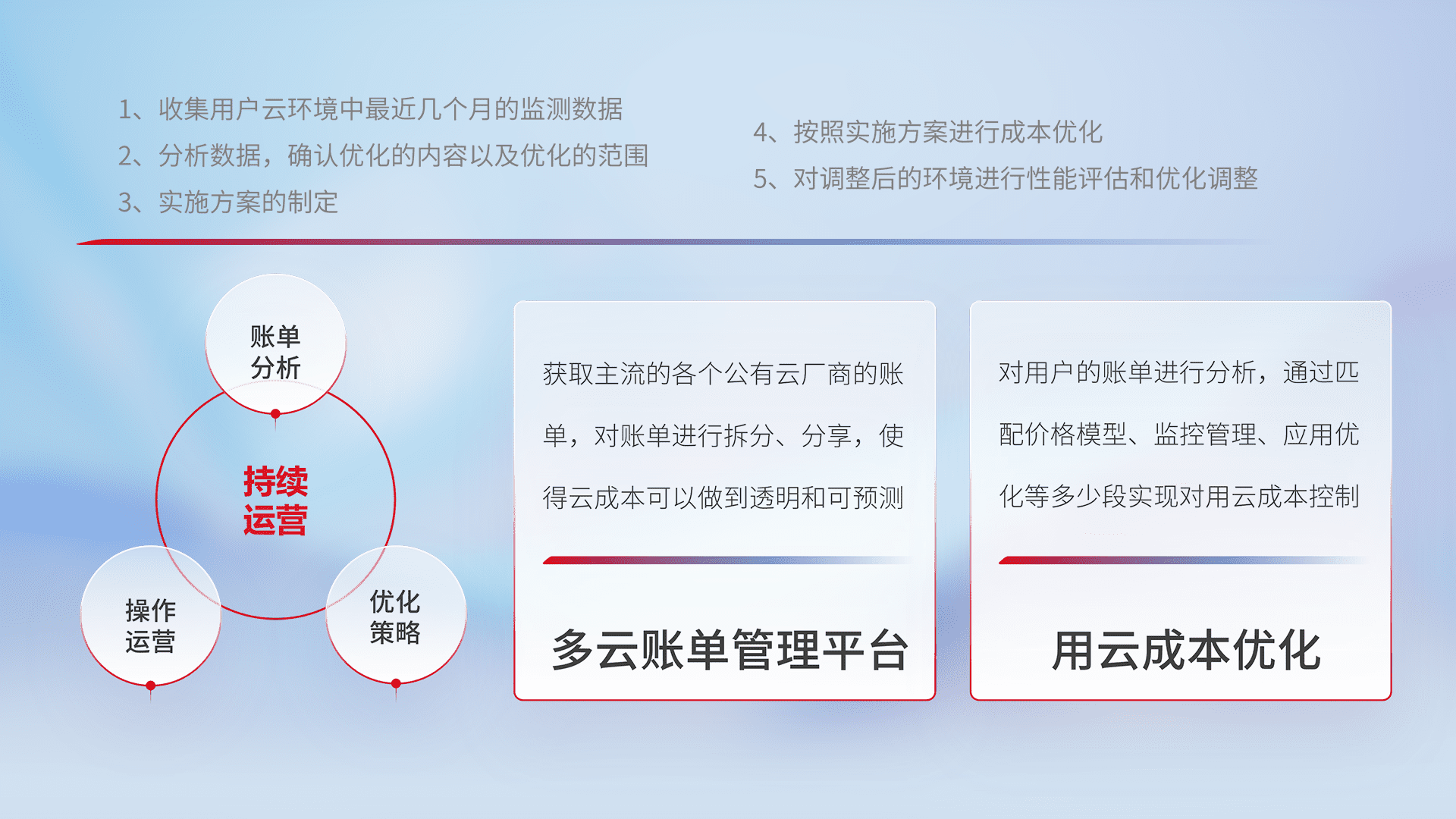 通过多云纳管,,,,以统一的资源数据模型把客户的云资源进行抽象和封装,,,进而实现对多云资源的统一操作,,保障云资源管理的可靠性、、、稳定性与可用性。。。。量身定制化运维内容,,,配置、、开发运维、、、补丁管理、、备份、、监控、、、认证和访问管理、、、、审计和日常巡检等,,,,保障在用云过程中的可靠度,,,稳定度以及高可用率。。。